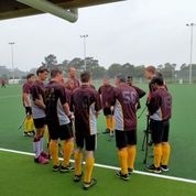 Team talk; Dhiren Keshaw signaling for the ball; Wayne Highet taking shelter